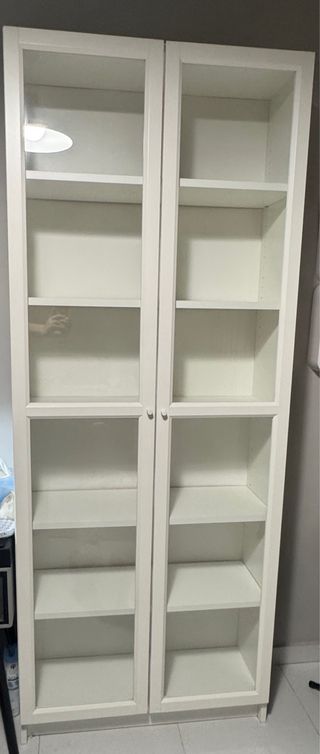 Estantería alta de la serie Billy de Ikea, con puertas de cristal. - Color blanco. - Fabricada en madera. - Diseño de dos puertas con tiradores. - Múltiples baldas para organización. Tiene un desperfecto en uno de los lados, se puede ver en la segunda foto.