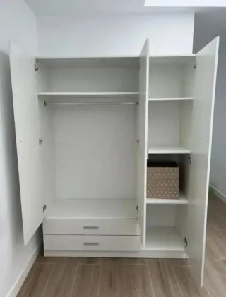 Armario de tres puertas con dos cajones inferiores. Ideal para organizar tu ropa y accesorios. - Acabado en blanco. - Tiradores metálicos en los cajones. - Interior con baldas y barra de colgar.
