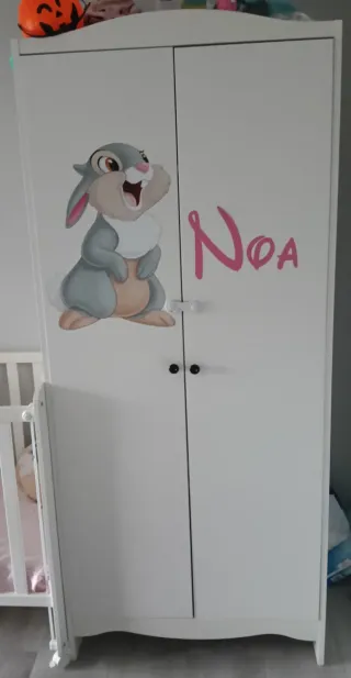 Armario infantil decorado con un simpático dibujo de un conejo y el nombre 'Noa'. - Puertas con tiradores negros. - Diseño blanco y moderno.