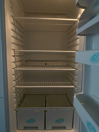 Nevera de color blanco, ideal para mantener tus alimentos frescos. - Estantes de rejilla. - Cajones inferiores. - Puerta con compartimentos.
