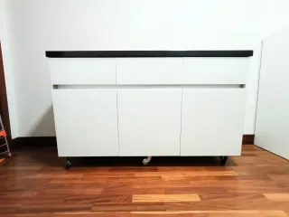 Mueble versátil que puede usarse como cómoda o armario. Su diseño moderno combina melamina gris para el interior, lateral y trasera con vidrio blanco en los frentes de puertas y cajones además de una encimera de silestone negro jaspeado brillante. Tiene ruedas para su fácil manejo. 3 cajones + 3 puertas (con división de una balda en todos los espacios). Medidas: largo 153 cm, ancho 40 cm y alto de 93 cm. Hecho por ebanista a medida. Precio 620 euros.