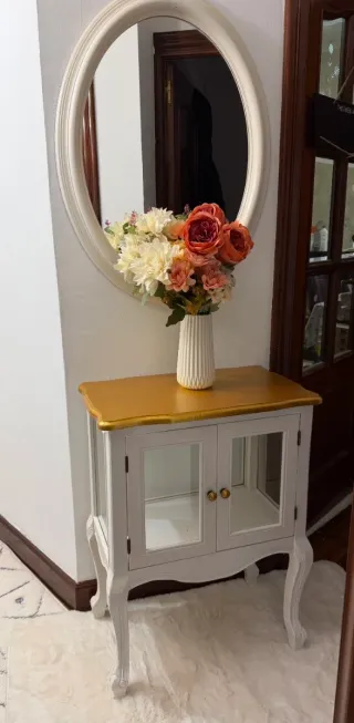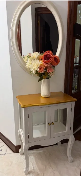 Conjunto de mueble de entrada y espejo. - Mueble con acabado blanco y detalles dorados. - Puertas de cristal con tiradores. - Espejo ovalado con marco blanco.NO incluye florero medidas 80x55x32cm