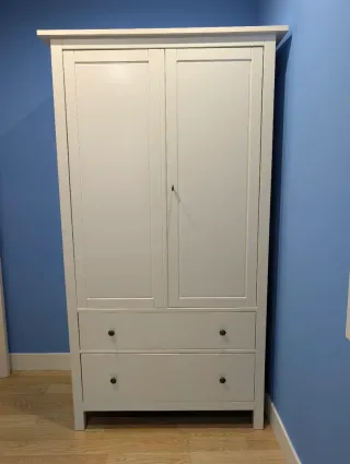 Armario de dos puertas con cajones inferiores Ikea Hemnes. Ancho:100cm Alto:198cm y Fondo:59cm Tiene barra de lado a lado para colgar la ropa que olvidé sacar en las fotos. Está en muy buen estado y se entrega parcialmente desmontado. Se encuentra en Barakaldo.