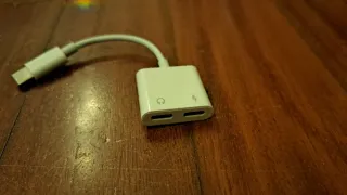 Adaptador blanco para dispositivos con puerto USB-C. Permite conectar auriculares con USB-C y cargar el dispositivo simultáneamente. - Conector USB-C. - Puerto de carga.