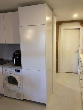 Frigorífico de color blanco con un diseño moderno. Es panelable y el mueble lo regalamos. El frigo mide 1.56 mts. Con el mueble son 2.28 mts. Tiene almacenaje encima Instrucciones de montaje incluidas. - Acabado liso y brillante. - Puerta reversible