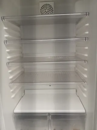 Frigorífico Selecline modelo 400051. Nevera con congelador en la parte baja, varios estantes y cajones transparentes para mejor organizacion. - Color blanco. - Puerta con estantes. - Cajones inferiores para verduras. - Bandejas de plastico. Funciona perfectamente, se vende por reforma completa de cocina. Mas mobiliario en mi perfil. La esquina superior izquierda tiene el plastico roto se aprecia en la ultima foto. Mide 174 cm de alto. A recoger en Burgos zona la salle.