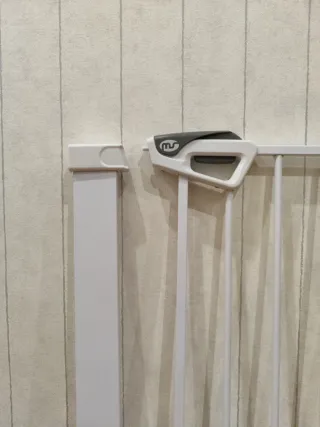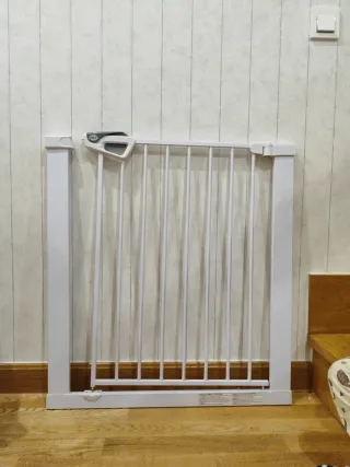 Barrera de seguridad blanca, ideal para escaleras y puertas. Fácil de instalar y desmontar. - Construcción metálica resistente. - Diseño de barras verticales. - Mecanismo de cierre seguro.