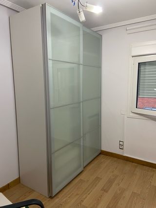 Armario de gran capacidad con puertas correderas de cristal. Se encuentra en muy buen estado. - Diseño moderno. - Acabado en plateado y blanco. Precio negociable