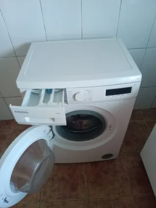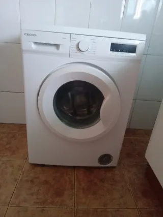 Lavadora de carga frontal ICECOOL en color blanco. Diseño moderno y funcional. - Panel de control digital. - Puerta frontal redonda. - Compartimento para detergente. Único k le falta es los plásticos de adentro del bombo pero funciona perfectamente