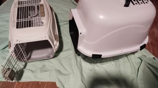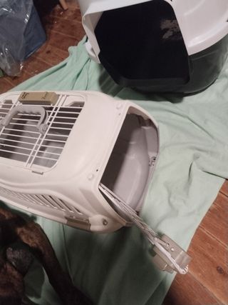 Práctico arenero y transportín para mascotas en muy buen estado. - Transportín con puerta de rejilla por arriba y por delante, con cierre de seguridad. - Arenero con tapa, se puede usar abierto y cerrado. - Color crudo y gris clarito y blanco y negro. - Limpiado a conciencia, llevaban tiempo guardados y tenían polvo . El trasportín está prácticamente nuevo. - El arenero se usó poco porque tengo siempre varios.
