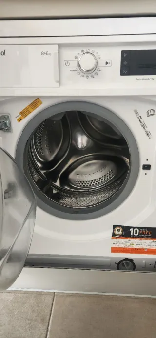 Lavadora-secadora de la marca Whirlpool con capacidad de 8kg para lavado y 6kg para secado. Diseñada para integrarse en tu hogar. - Color blanco. - Panel de control con selector de programas y pantalla digital. - Puerta frontal con acabado en cristal oscuro. No funciona el secado, lava perfectamente