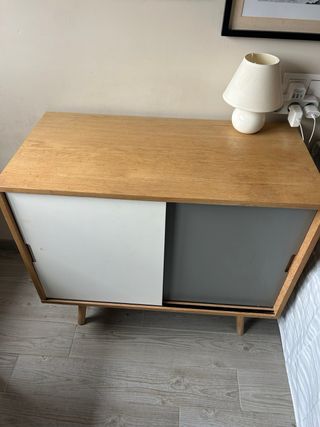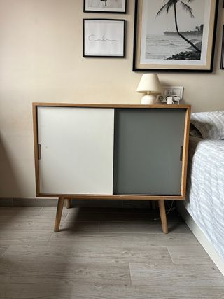 Mueble aparador con un diseño moderno y funcional. - Dos puertas correderas. - Combinación de acabados en blanco y gris. - Patas de madera estilo nórdico.