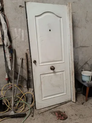 Puerta de metal para exterior, recién pintada de blanco. Está en perfecto estado. - Medidas aproximadas: (Añadir medidas si se conocen) - Fabricada en metal resistente. - Color blanco.
