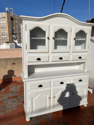 Elegante mueble aparador de madera maciza, dividido en dos partes para mayor versatilidad. - Vitrinas, puertas y cajones - Diseño de dos cuerpos. - Acabado en blanco, originalmente color marron. - Se podria restaurar a su color original Solo se vende para recogida en persona
