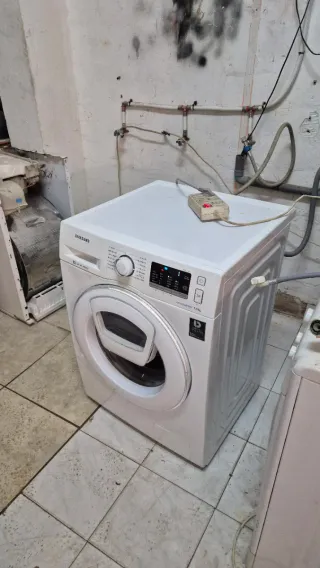 Lavadora de carga frontal Samsung en color blanco. Diseño moderno y elegante. - Panel de control digital. - Puerta frontal con acabado brillante. - Capacidad de carga adecuada para familias.