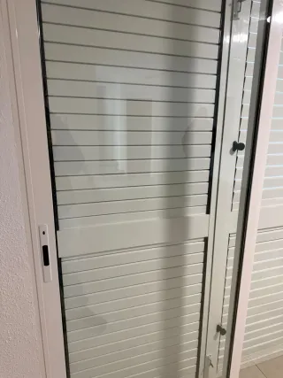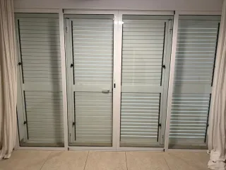 Puerta corredera de doble cristal con cuatro hojas. Ideal para separar ambientes o como salida a balcón o terraza. - Diseño moderno y luminoso. - Marco de aluminio blanco. - Tres cierres ( zona central y dos laterales). - Sin desperfectos o roturas. -Ancho 3,35metros Altura 2,23metros