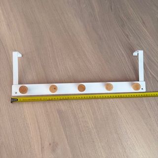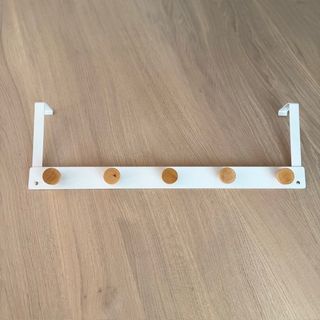 💫 Perchero para puerta en hierro color blanco y con 5 colgadores de madera clara. Marca Sklum. 📏 Ancho 50cm. x alto 16,2cm. y para ancho de puerta de hasta 4,5cm. Profundidad de los colgadores: 2,7cm. ✔️ Sin usar, totalmente nuevo, sin desperfectos ni defectos. 📦 Incluye caja, instrucciones y embalaje original.