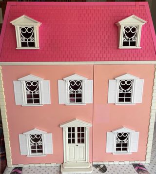 Encantadora casa de muñecas de Hello Kitty, perfecta para horas de juego. - Diseño de tres pisos. - Techo rosa con tejas. - Fachada en tonos pastel. - Múltiples ventanas con detalles. - Puerta principal blanca.