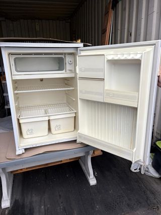 Nevera blanca compacta, ideal para espacios reducidos. - Puerta con compartimentos. - Cajones extraíbles en la parte inferior. - Estantes interiores. - Congelador integrado.