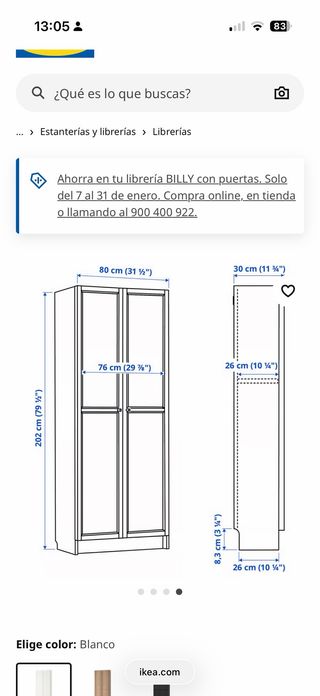 Estantería BILLY de Ikea con puertas. Ideal para organizar tus libros y objetos. - Medidas: 202 cm (alto) x 80 cm (ancho) x 30 cm (fondo). - Puertas con diseño de cristal. - Acabado en blanco.