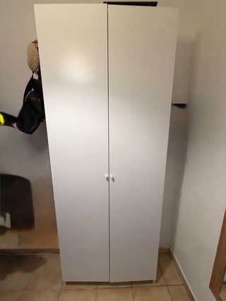 Armario de dos puertas de IKEA, perfecto para una habitación infantil. Su diseño es sencillo y funcional. - Color blanco. - Dos tiradores negros. Nuevo cuesta 139€