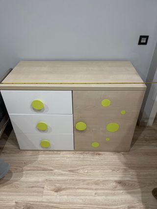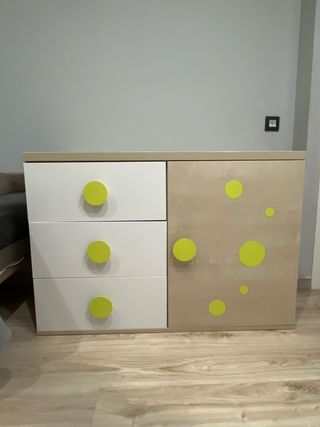 Cómoda infantil con un diseño alegre y divertido, perfecta para habitaciones de niños. - Frontales de cajones en blanco. - Tiradores redondos de color verde lima. - Puerta lateral con diseño de círculos. - Acabado en madera clara. - Barra de colgar interior - De madera maciza - Desmontar y recoger en el centro de Castellón - Muy poco uso