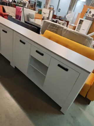 El domingo se lo entregamos a un familiar si no se vende. Regalado de precio porque nos tenemos que deshacer de él. Mueble de madera con un diseño elegante y acabado en blanco. Precio original de compra 1330€ - Puerta enrollable superior. - Compartimento central con estante. - Cajones con tiradores decorativos. - Detalle de cristal en uno de los cajones.