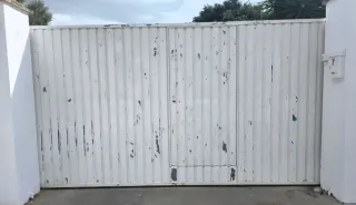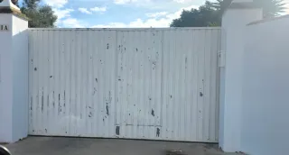 Puerta corredera de panel sándwich en color blanco. Mientras este el anuncio es que sigue disponible. Puerta corredera de ocasion casi nueva en muy buen estado y en panel sanwich en color blanco, con puerta peatonal dentro y con cerradura electrica prevista para abrir con telefónillo. Ideal para entrada de garaje o jardín. Medidas 4,26 metros de ancha x 2,01 metros de alta. Esta preparada para automatizar. Solo tengo la hoja y la U de cierre. - Fabricada en tubos galvanizados y panel sándwich blanco de 40 mm de espesor. TAMBIÉN POSIBILIDAD DE HACERSELA NUEVA A MEDIDA A BUEN PRECIO Y EN EL COLOR Y EL MATERIAL QUE QUIERA.