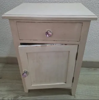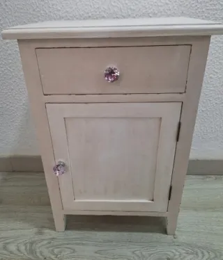 Mesita auxiliar con un diseño encantador y detalles únicos. - Acabado en color blanco. - Tiradores de cristal en tono rosa. - Estructura de madera. Un cajón y una puerta
