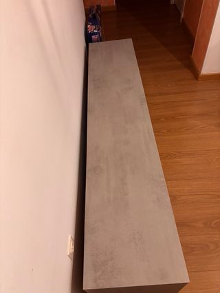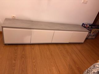 Mueble de salón con un diseño moderno y elegante, combinando acabados en gris y blanco. - Cuatro puertas frontales. - Superficie superior inclinada. - Base gris. (Lo vendo porque no consigo poner las puertas derechas)