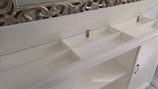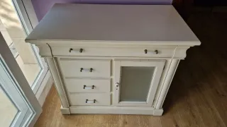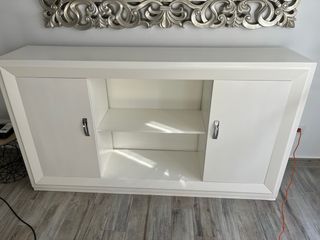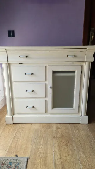 Bonito mueble de salon en color blanco. Se compone de dos puertas y seis cajones. Los tiradores son de metal dorado. Perfecto estado. Madera maciza.