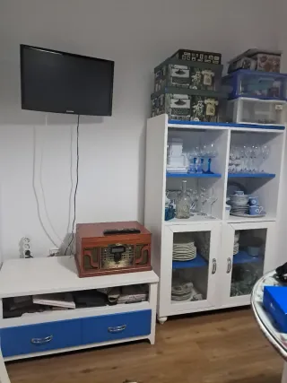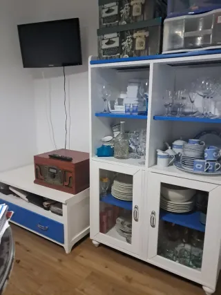 Conjunto de vitrina, mueble tv, mesa y sillas. Ideal para salón, comedor, salita salita. - Mueble de TV con cajón. Blanco y azul. Madera maciza. - Vitrina con puertas de cristal y estantes interiores. Blanco y azul. Madera maciza. - Cuatro sillas blancas. - Mesa redonda de 90 con tapa de cristal.
