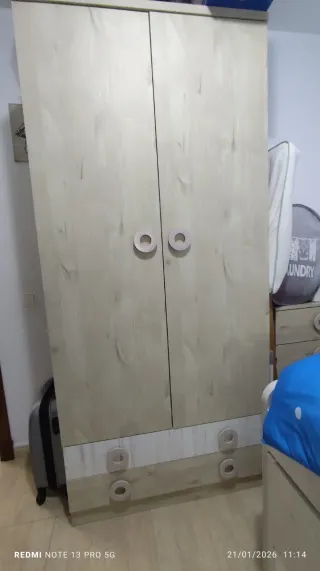 Armario de dos puertas con un diseño moderno y elegante. - Acabado en madera con detalles en blanco. - Tiradores circulares. - Base con dos cajones. Medidas: 100 ancho 52 fondo y 220 de alto Está en muy buenas condiciones, lo vendo porque necesito uno más pequeño para el hueco que me ha quedado después de poner la cama en la habitación. Ver sin compromiso.