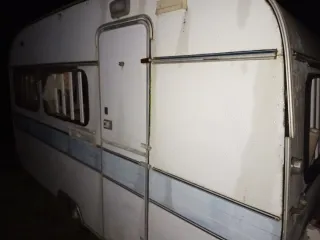 Caravana en venta. - Exterior blanco con detalles en azul. - Ventanas con rejas. - Puerta de acceso.