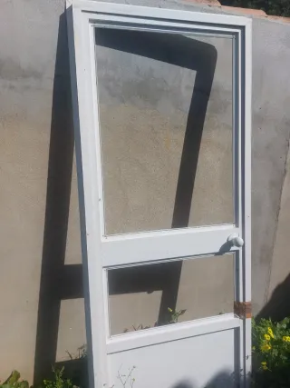 Puerta mosquitera de aluminio en color blanco. Medidas 207 x 88.5 el marco. Los huecos que se ven son para las mosquiteras. - Marco de aluminio. - Diseño con paneles. - Incluye pomo y cerradura.