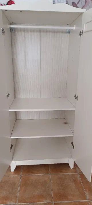 Armario infantil de dos puertas con un diseño encantador. Perfecto para organizar la ropa y juguetes. - Color blanco. - Dos pomos redondos de color rosa. - Adhesivos decorativos de figuras. - Diseño con borde superior ondulado. Algunas marcas de uso