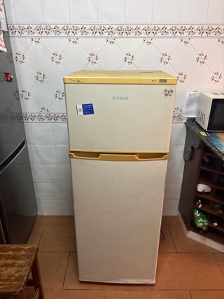 Frigorífico de la marca Edesa, en buen estado. - Color blanco y detalles en amarillo. - Diseño de dos puertas.