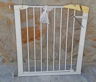 Barrera de seguridad, marca Munchkin, de 75cms de alto por 70cms de ancho, más el largo que se le dé al tornillo. Estructura metálica en blanca, incluye los 4 tornillos a presion y no necesita taladro. Ideal para niños o mascotas.