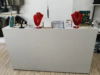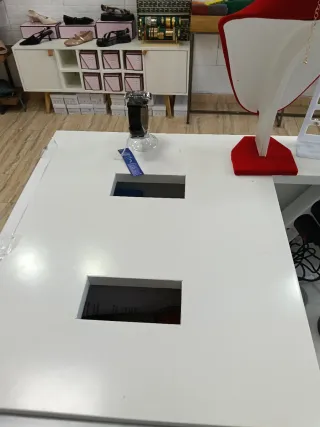 Mostrador de tienda con un diseño moderno y elegante. - Estructura principal en color blanco Es d emucha calidad nada de aglomerado madera maciza Tiene seis cajones y dos huecos para alarmado también tiene dos huecos para colocar productos como por ejemplo perfumería o quizás bisutería como es en mi caso También tiene una puerta para guardar como almacenaje y debajo mostrador también Medida 190 largo 105 alto 50 ancho