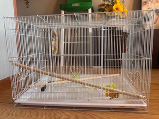 Jaula para pájaros de color blanco, ideal para mantener a tus mascotas seguras y cómodas. - Estructura de alambre resistente. - Bandeja extraíble para facilitar la limpieza. - Incluye dos perchas de madera. - Puerta frontal para acceso. Y dos más para comederos - Diseño con adornos en forma de corazón en los laterales. -Dos recipientes incluidos -Juguete con cascabel y tronco de madera incluido