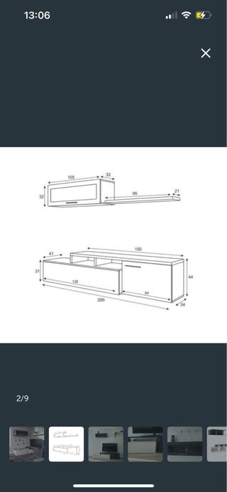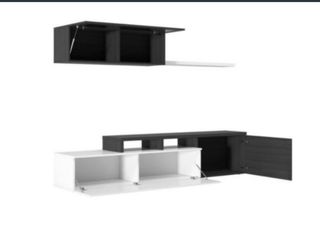Conjunto de muebles de TV con un diseño moderno y elegante. - Acabado en blanco y negro. - Mueble superior con dos compartimentos. - Mueble inferior con puertas abatibles.