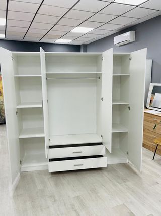 Armario de gran capacidad con un diseño moderno y limpio. - Cuatro puertas. - Dos cajones inferiores. - Acabado en blanco.