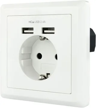 03368. ABIERTO SIN USAR. BASE ENCHUFE PARED NANO CABLE TOMA SCHUKO 2xUSB MAX.2.4A BLANCA. NO INCLUYE LOS TORNILLOS. Producto apto para empotrar en cajetín universal mediante tornillos Toma de corriente CEE 7/3 2 puertos de carga USB tipo A de carga máxima 2.4A totales Entrada máxima: 16A/250V Salida USB: Max. 5V/2.4A total