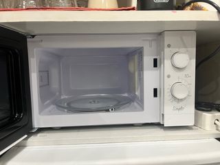 Microondas de color blanco, perfecto para tu cocina. Cuenta con mandos giratorios para ajustar la potencia y el tiempo. - Diseño compacto. - Mandos de control de potencia y tiempo. - Puerta con cristal.