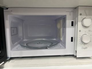 Microondas de la marca Simply en color blanco. Su diseño es compacto y funcional. - Puerta con apertura lateral. - Plato giratorio interior. - Mandos de control sencillos.