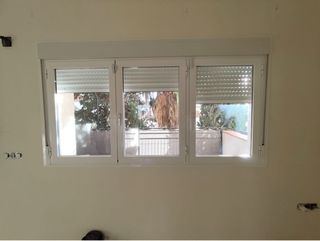 Ventana de tres hojas con marco blanco. - Marco de PVC blanco. - Persianas enrollables integradas. Características: Ventanas: Tres hojas de 72x105 cms Estructura de interna o de cogida 235x126 cms incluido recogedor de persianas Medidas con marcos: 242,50x132,50 cms Huecos de luz: ancho de dos ventanas 142x100 Ancho de una ventana 67x100 cms