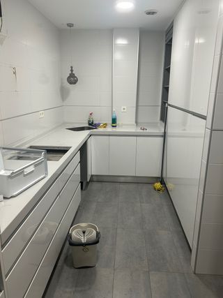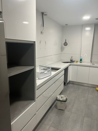 Cocina moderna con acabados en blanco. Va a ser demolida en 5 dias, interesados se la tienen que llevar este próximo fin de semana. Lamento la urgencia pero se la iban a llevar y al final al comprador no le ha cuadrado, y yo ya no contaba con ella y van a entrar los albañiles el martes. 2 módulos con 3 cajones de 90cm 1 módulo de 3 cajones de 60cm 1 módulo con persiana de 72cm de ancho x 150cm de alto 2 módulos almacenaje de 4 puertas, 2 arriba y 2 abajo de 88x250cm Columna horno/microondas de 60x250cm, con cajones inferiores y puerta superior Módulo de puertas superiores para frigo-congelador side by side 120cm de ancho