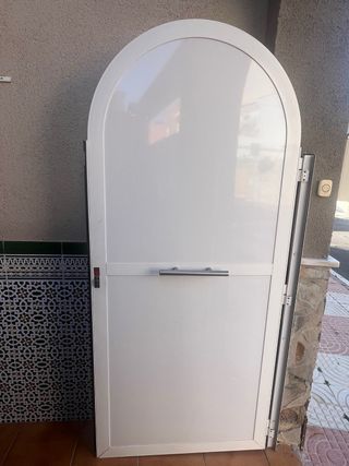 Puerta de entrada de aluminio en color blanco. Diseño con paneles verticales y arco superior. Medidas: 90 de ancho por 1,70 de alto. - Material: Aluminio - Color: Blanco - Diseño: Paneles verticales y arco