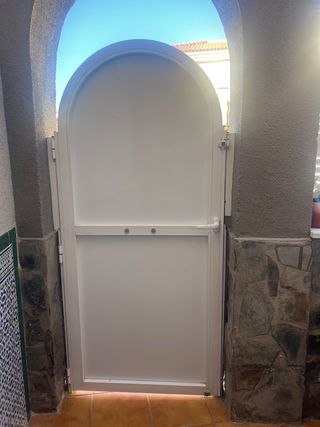 Puerta de cancela de aluminio en color blanco. Diseño moderno y elegante. - Material: Aluminio. - Color: Blanco. - Forma: Arco superior.