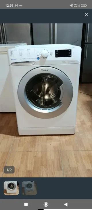 Lavadora de carga frontal Indesit con capacidad de 8kg. Su diseño es moderno y funcional. - Color blanco. - Panel de control con pantalla digital. - Puerta frontal con acabado plateado.